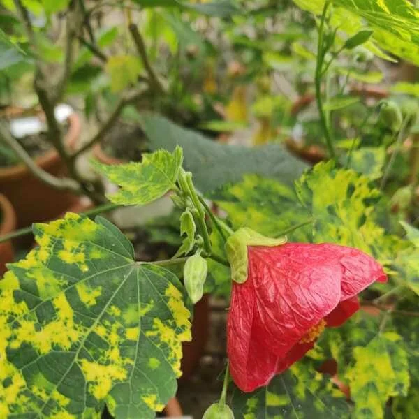 Abutilon Russell’s Dwarf is a half hardy evergreen shrub with variegated foliage and pendant crimson red bell shaped flowers in spring, summer and autumn.